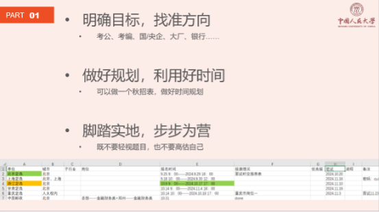 C师姐结合自身经历详细梳理了公考时间线,强调不同省市的考试时间存在一定差异,建议同学们提前做好功课,把握时间节点。接着分享了自己备考时的学习计划和刷题经验,提醒同学们早做准备,适应考试节奏。